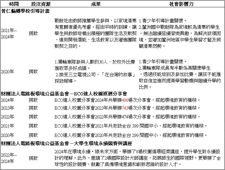 本公司每年贊助財團法人電路板環境公益基金會,舉辦綠色永續校園巡迴分享會活動,且本公司總經理亦於電路板環境公益基金會擔任常務董事。另本公司定期捐款予財團法人普仁青年基金會,為偏鄉青少年之發展提供資源,提升社會影響力。